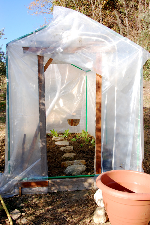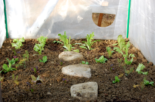 The greenhouse protects different type of wintersalads, Rucola and Mache (Verte de Cambrai). We also put in some chinese vegetables which are quite able to deal with the wintercold. Off now to check what the snow has done to our wintercrop.